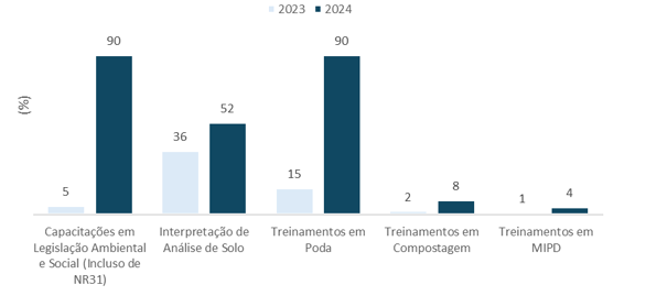 Gráfico 1. Evolução da porcentagem de propriedades cacaueiras capacitadas e orientadas através de consultorias realizadas pela Labor Rural, entre os anos de 2023 e 2024, de acordo com os temas mencionados.