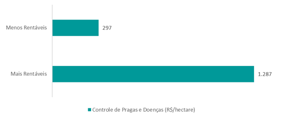 Por meio do acompanhamento dos produtores participantes em programas de certificação, a Labor Rural tem identificado e disseminado práticas de manejo produtivo cruciais para o sucesso da cacauicultura, impulsionando incrementos tanto na produtividade quanto na rentabilidade. Os produtores com os melhores resultados adotam consistentemente a poda e mantêm uma arquitetura de planta otimizada, além de investirem de forma mais eficaz no controle de pragas e doenças. Esses investimentos chegam a ser três vezes maiores em comparação com os produtores menos rentáveis, conforme demonstrado no Gráfico 2.
