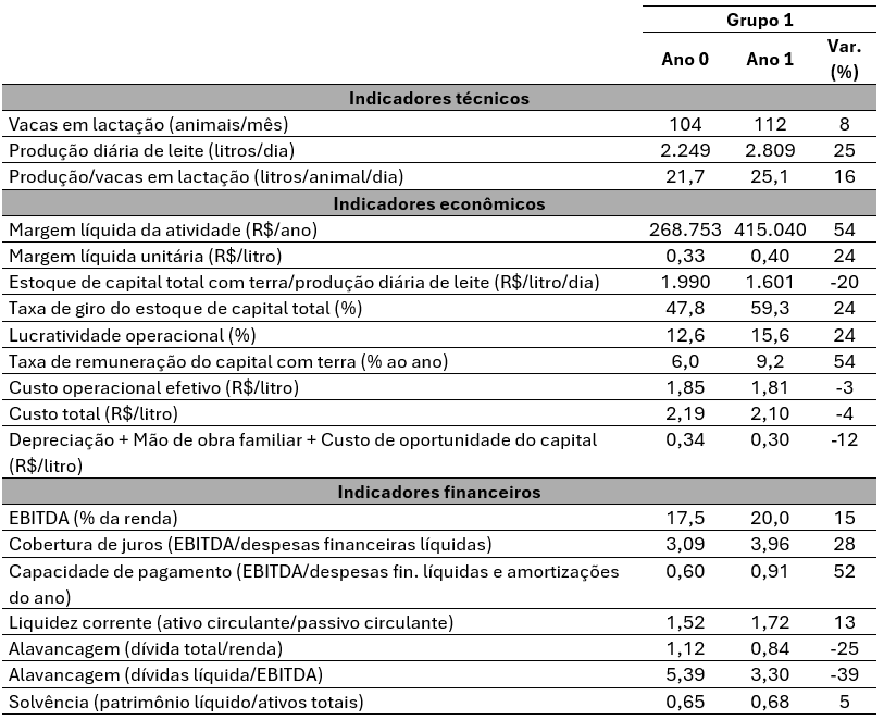Tabela 1. Resultados técnicos, econômicos e financeiros das fazendas do grupo 1 (reduziu o estoque de capital por litro após a migração para o Compost Barn).