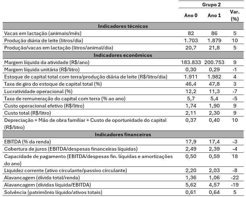 Tabela 2. Resultados técnicos, econômicos e financeiros das fazendas do grupo 2 (aumentou o estoque de capital por litro após a migração para o Compost Barn).